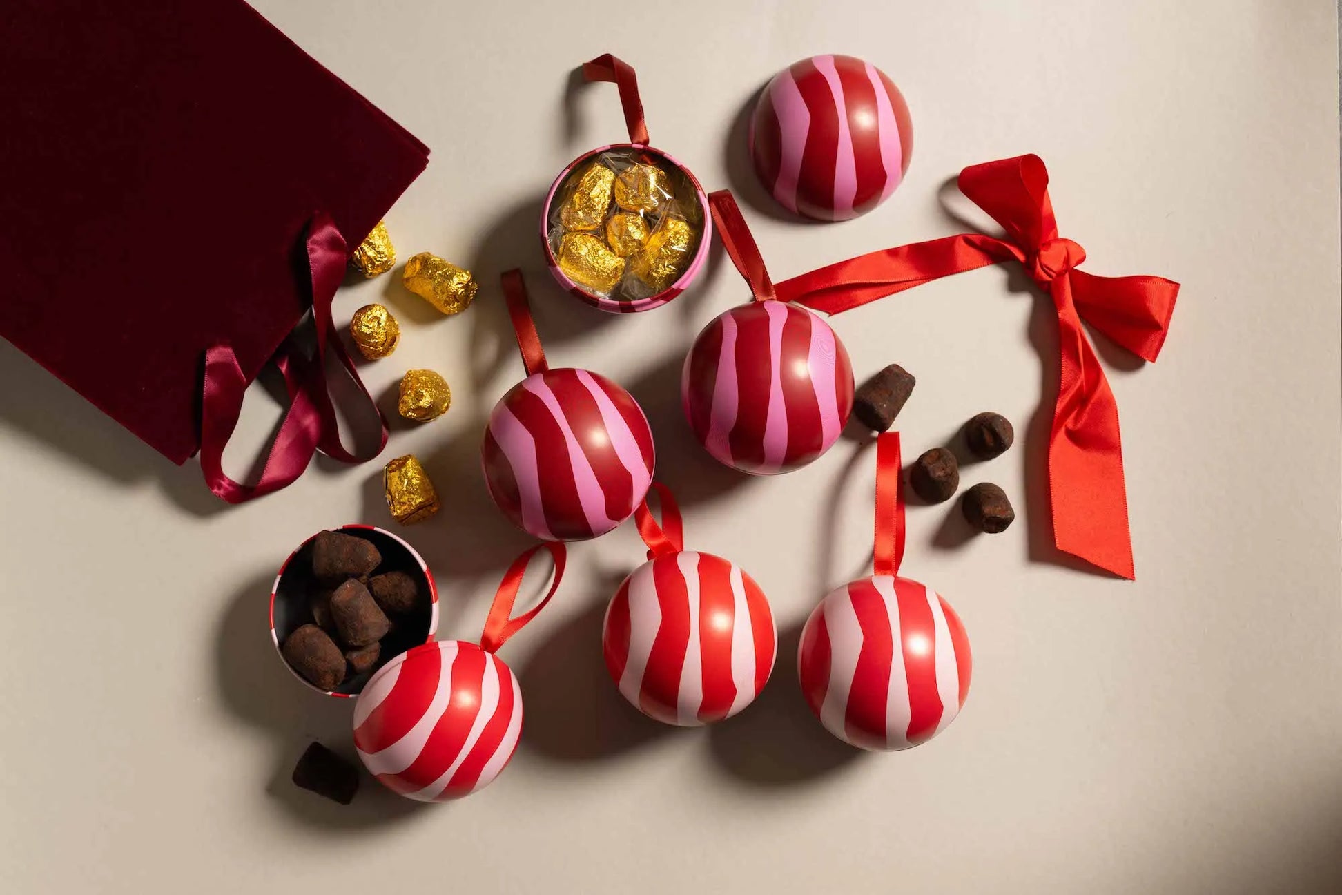 Our reusable Christmas baubles filled with chocolate truffles, they can be made fully bespoke too.
