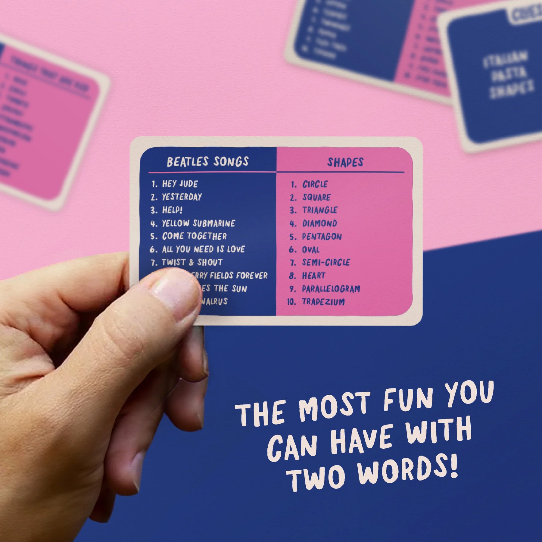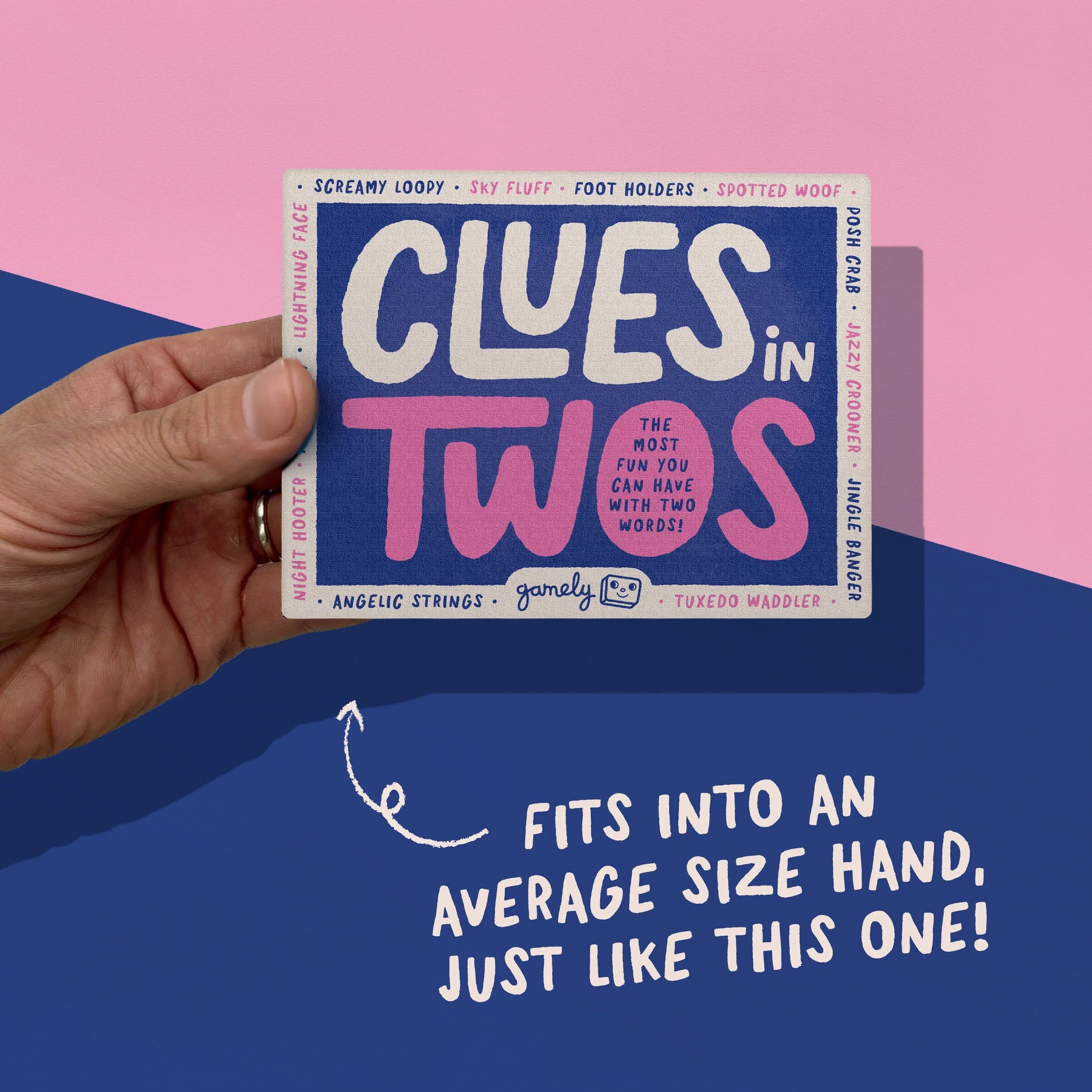 In Clues in Twos everybody has 90 seconds to write up to 10 TWO-WORD clues to describe 10 things. Swap your clues with another player and guess what they are describing. You both win points for correct guesses.