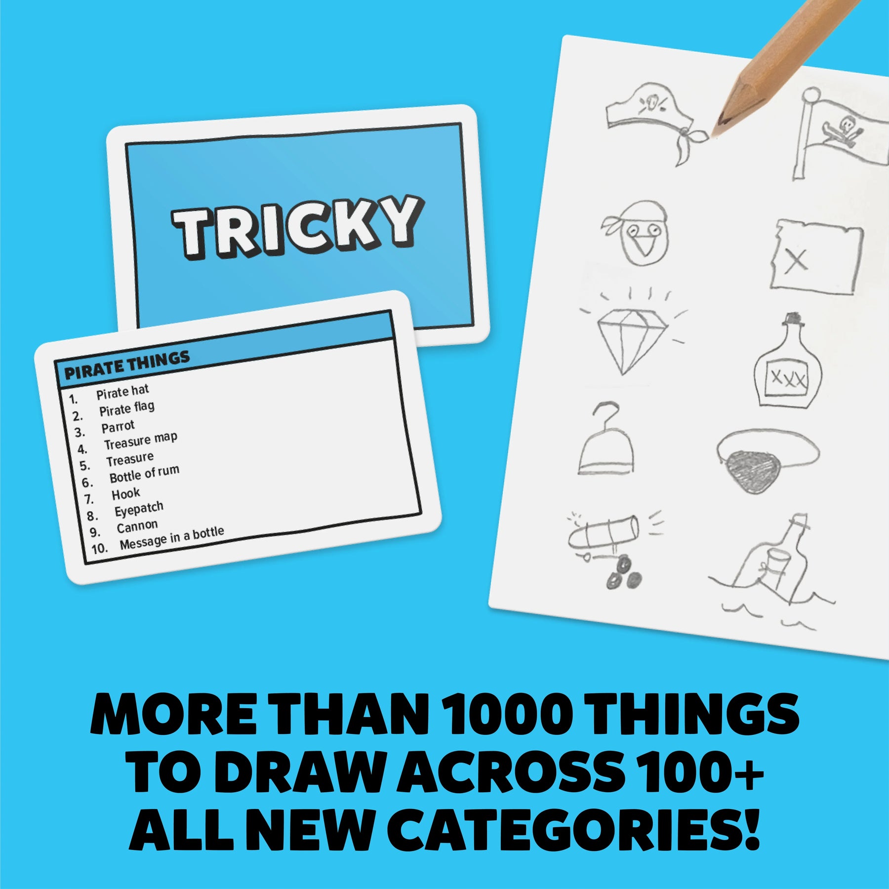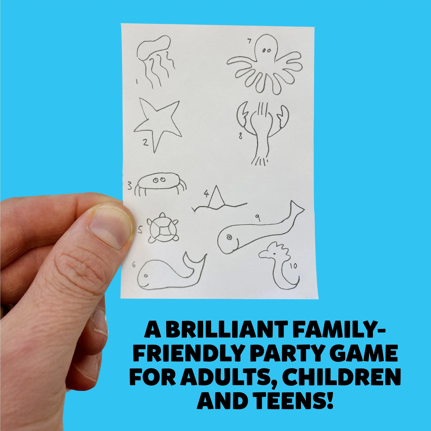 You probably know the score by now!... all players draw at the same time, and when the minute is up you pass your scribbles to another player. They have to figure out what you’ve drawn and if they guess correctly, you both score points!