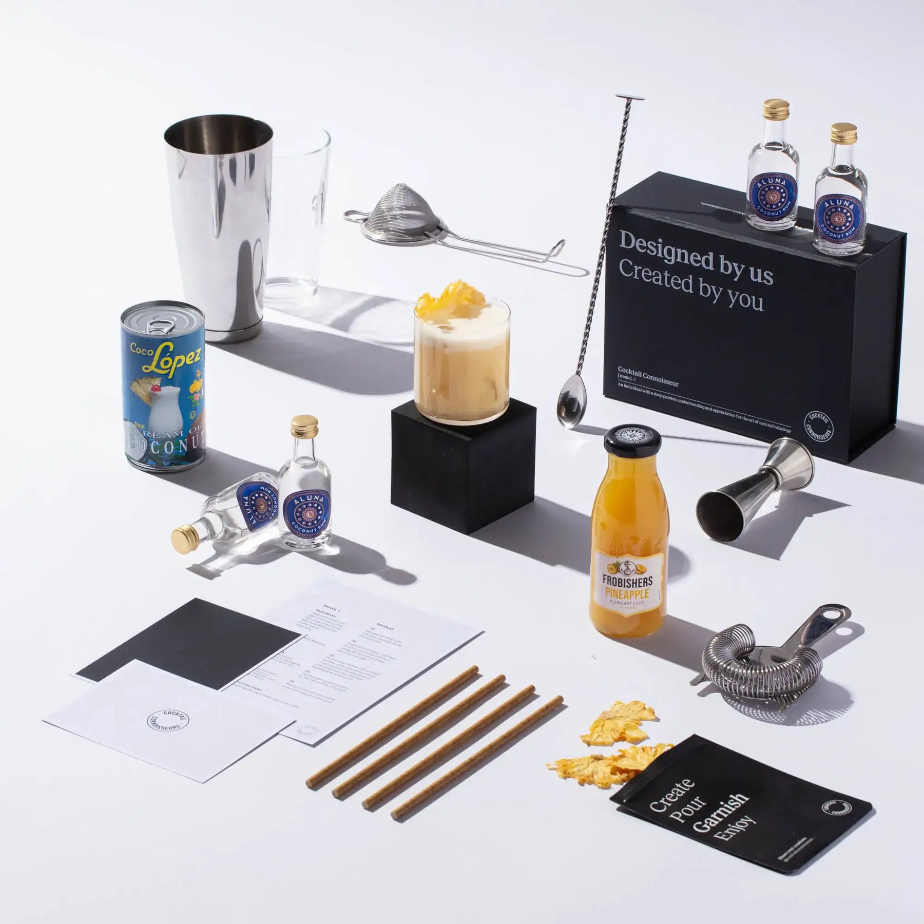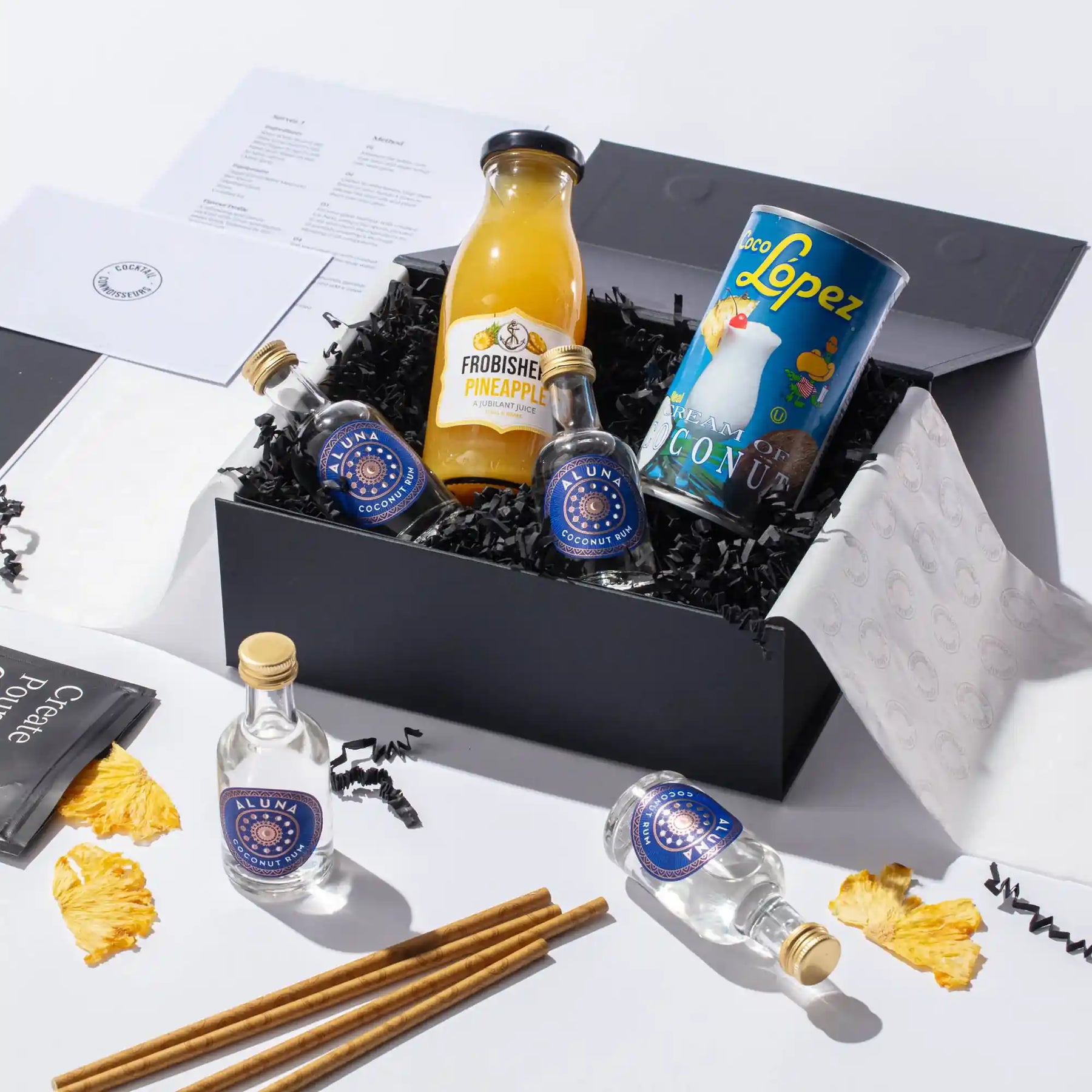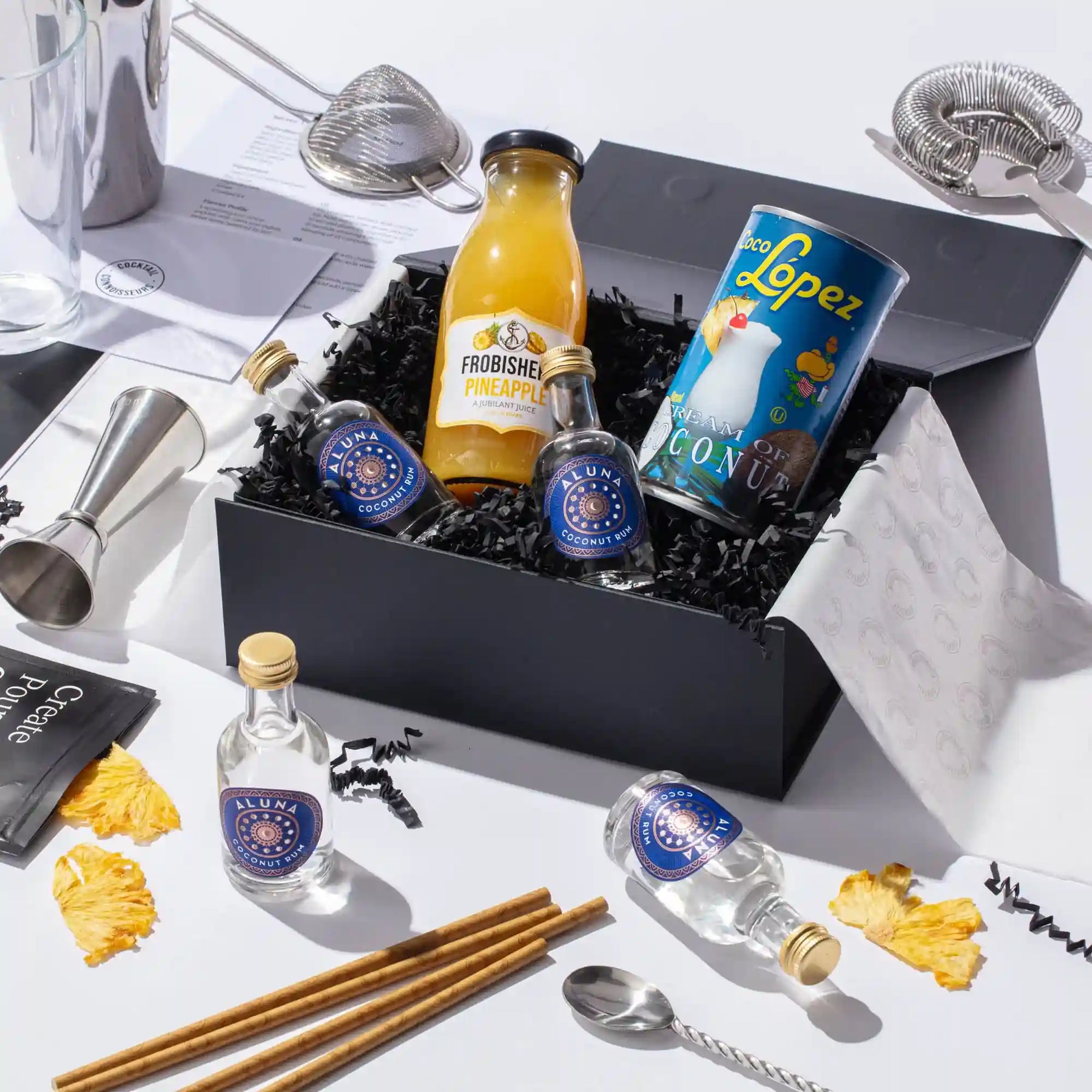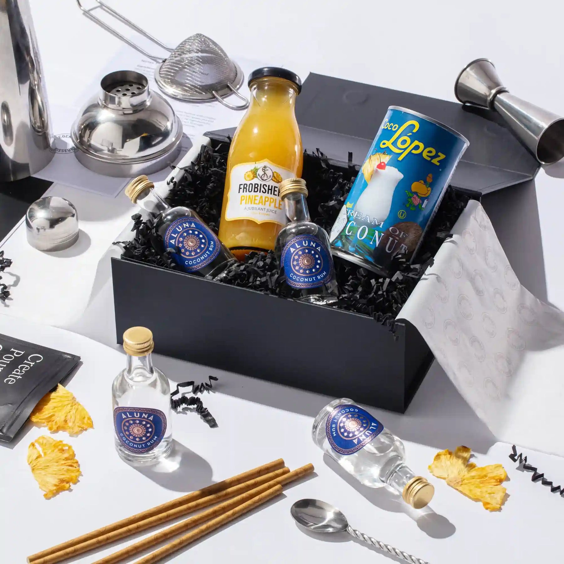 Discover the indulgence of our Piña Colada Cocktail Gift Set, bursting with tropical flavours to transport you to a beach paradise! Our kit includes premium coconut rum, luscious cream of coconut, fruity pineapple juice, and dehydrated pineapple halves for garnish. It also features a detailed cocktail recipe card and tutorial video, all elegantly packaged in a beautiful gift box. Enhance your mixology experience with optional bar equipment tools, suitable for both beginners and expert mixologists. Perfect for crafting four Piña Colada cocktails at home. Order your Piña Colada Cocktail Gift Set today!