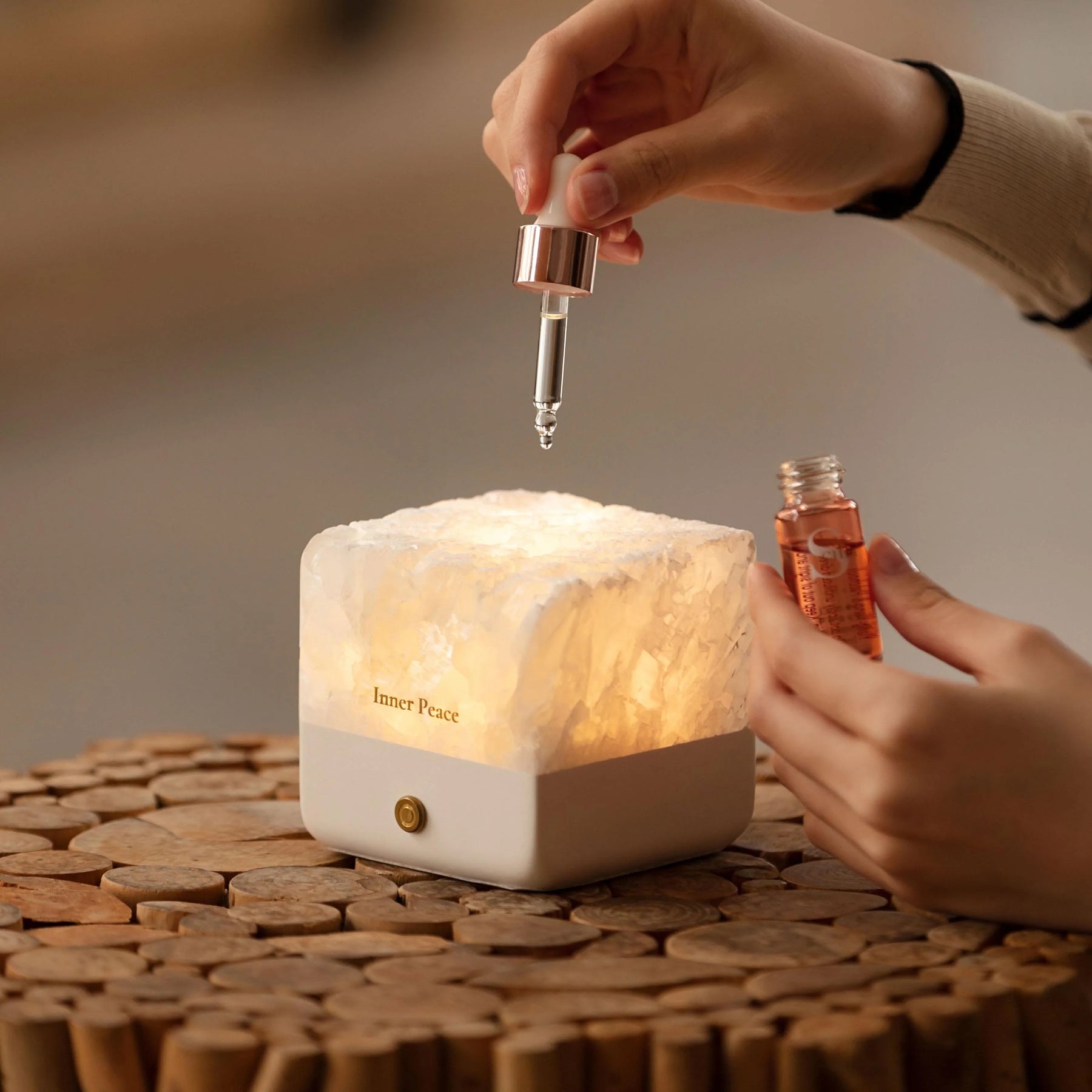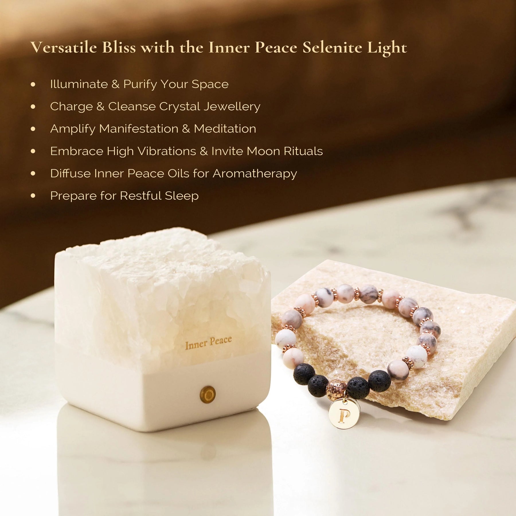 Soothing Aromatherapy: Elevate your space to a haven of tranquility with two bottles of Inner Peace pure essential oil included. Use the light as a diffuser and immerse yourself in the serene aromas of Lavender, Chamomile, Sandalwood, Ylang-Ylang, and Patchouli, enriched with the purity of Selenite's healing properties.