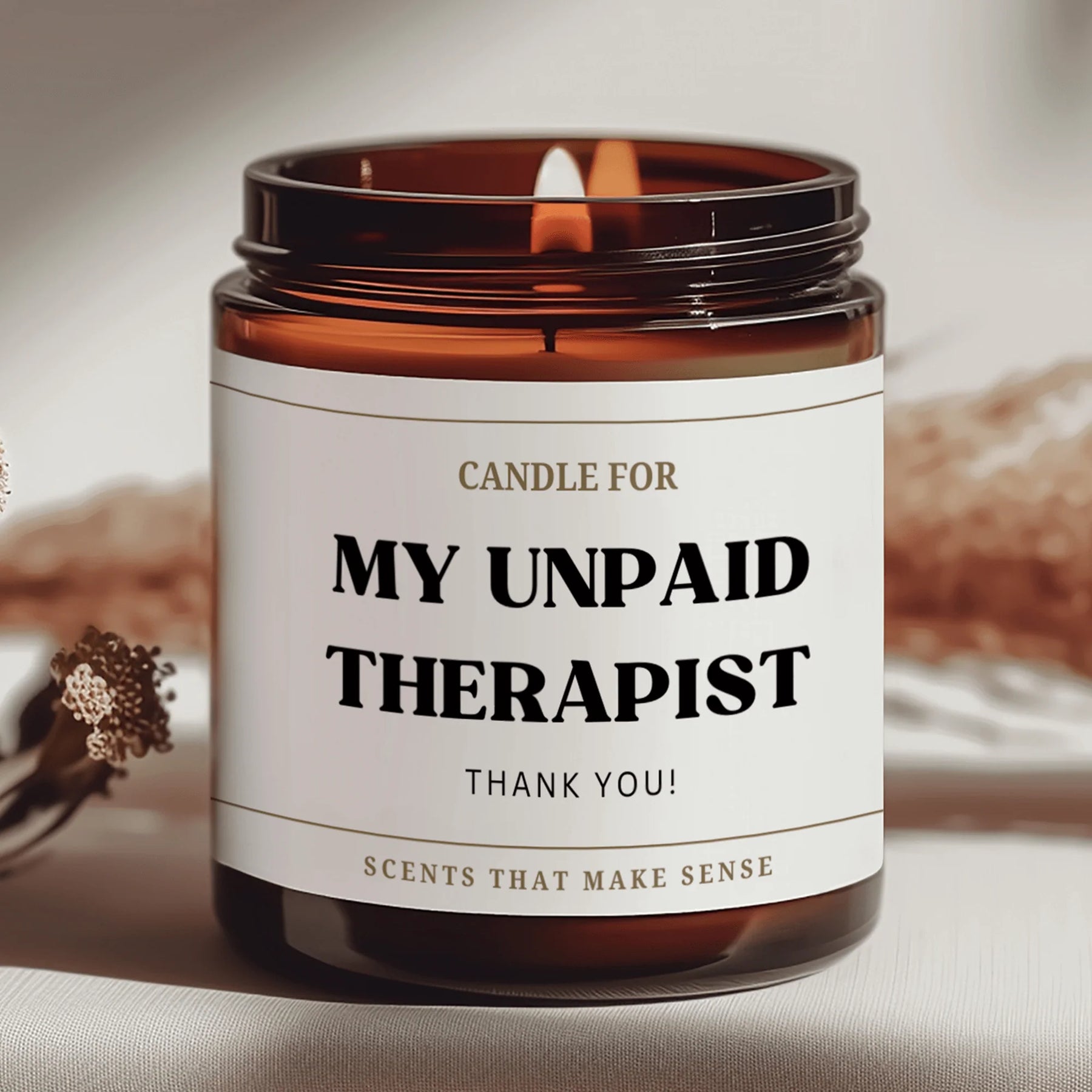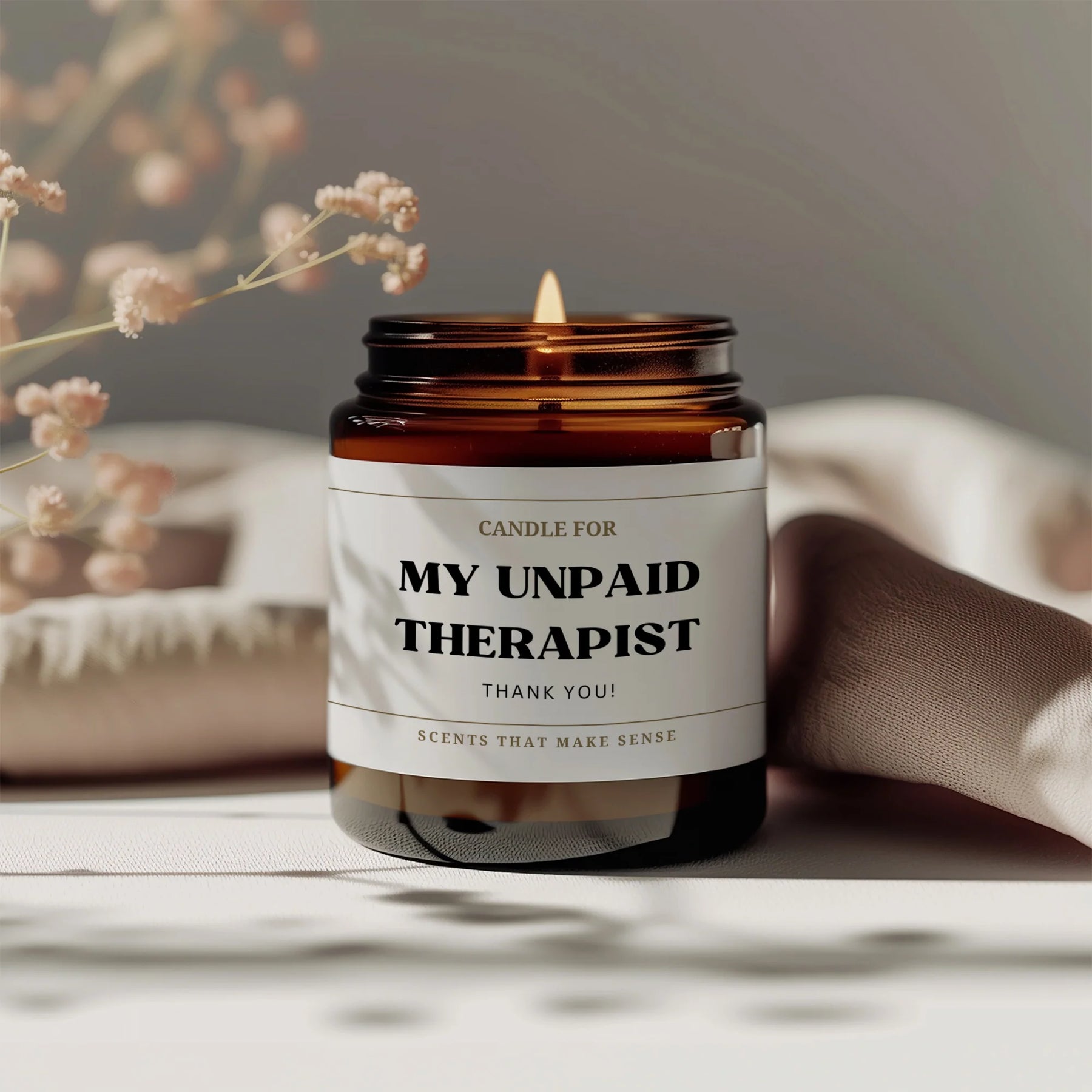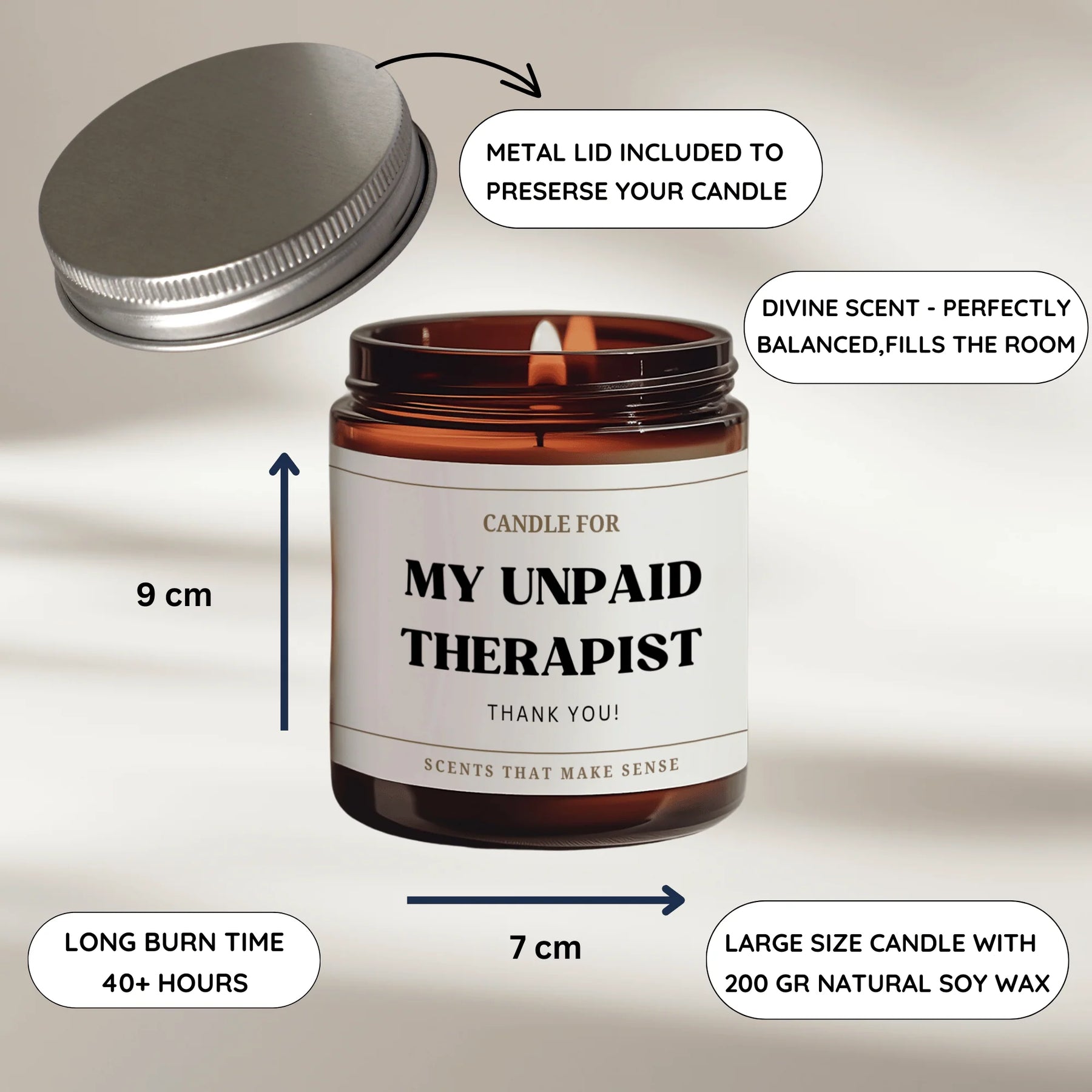 The perfect friendship gift for your bestie! Lighthearted and funny candle that tells your friend 'Thank you for being my unpaid therapist'. Original and distinctive gift with a twist of humour and a lovely scent.