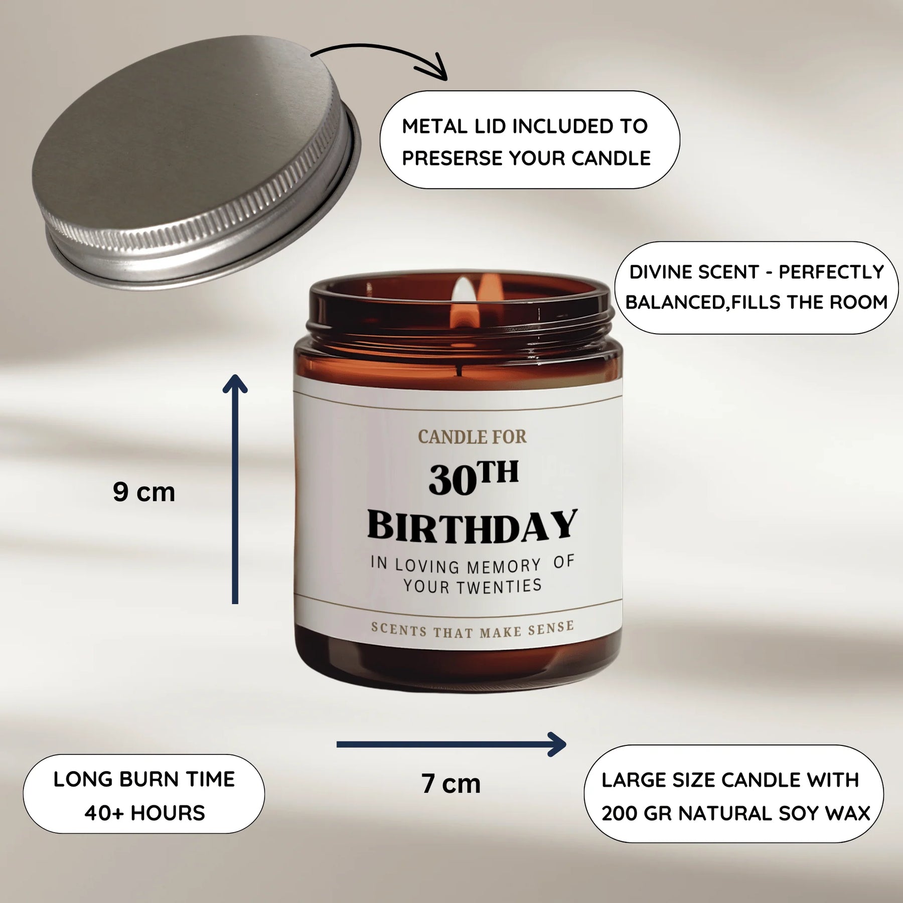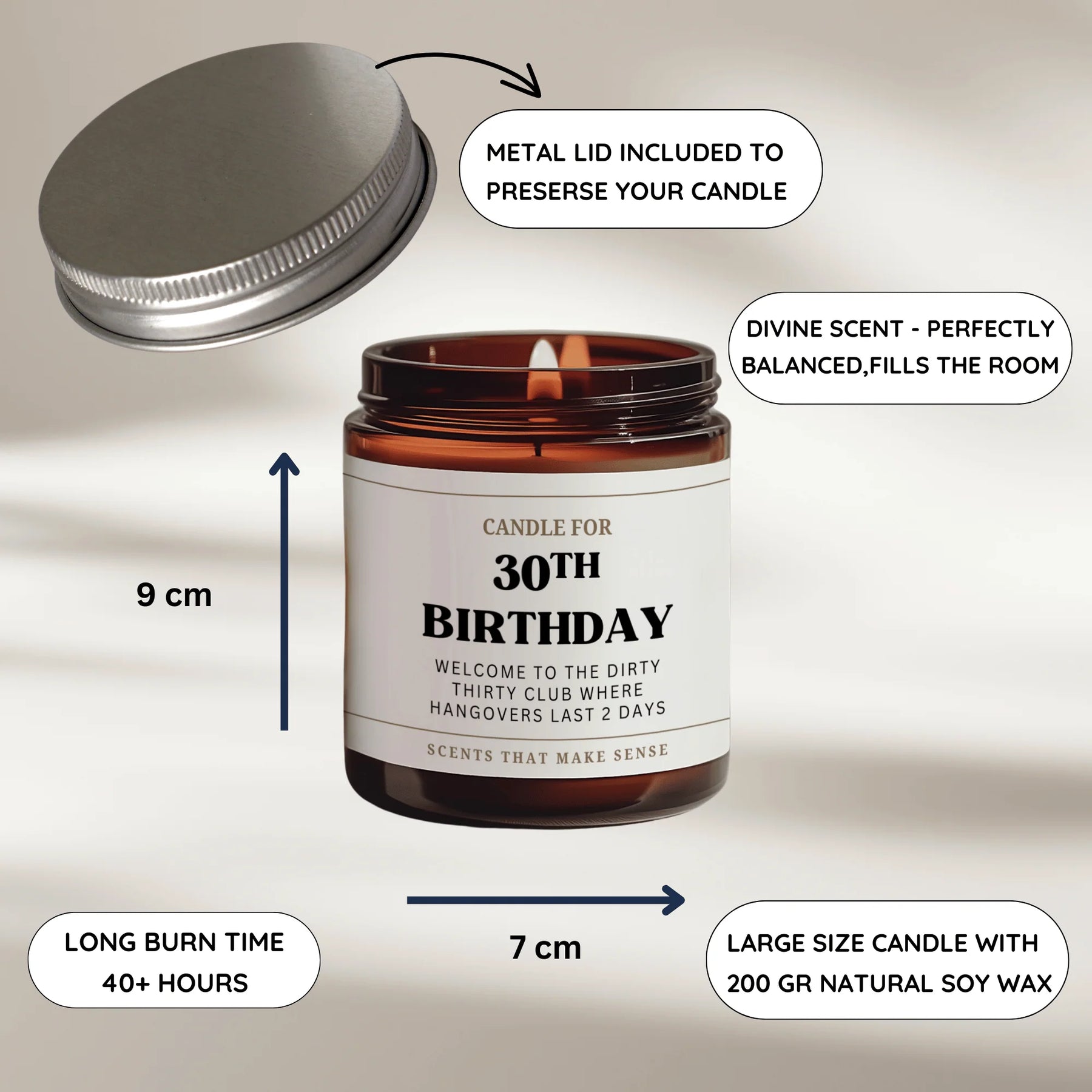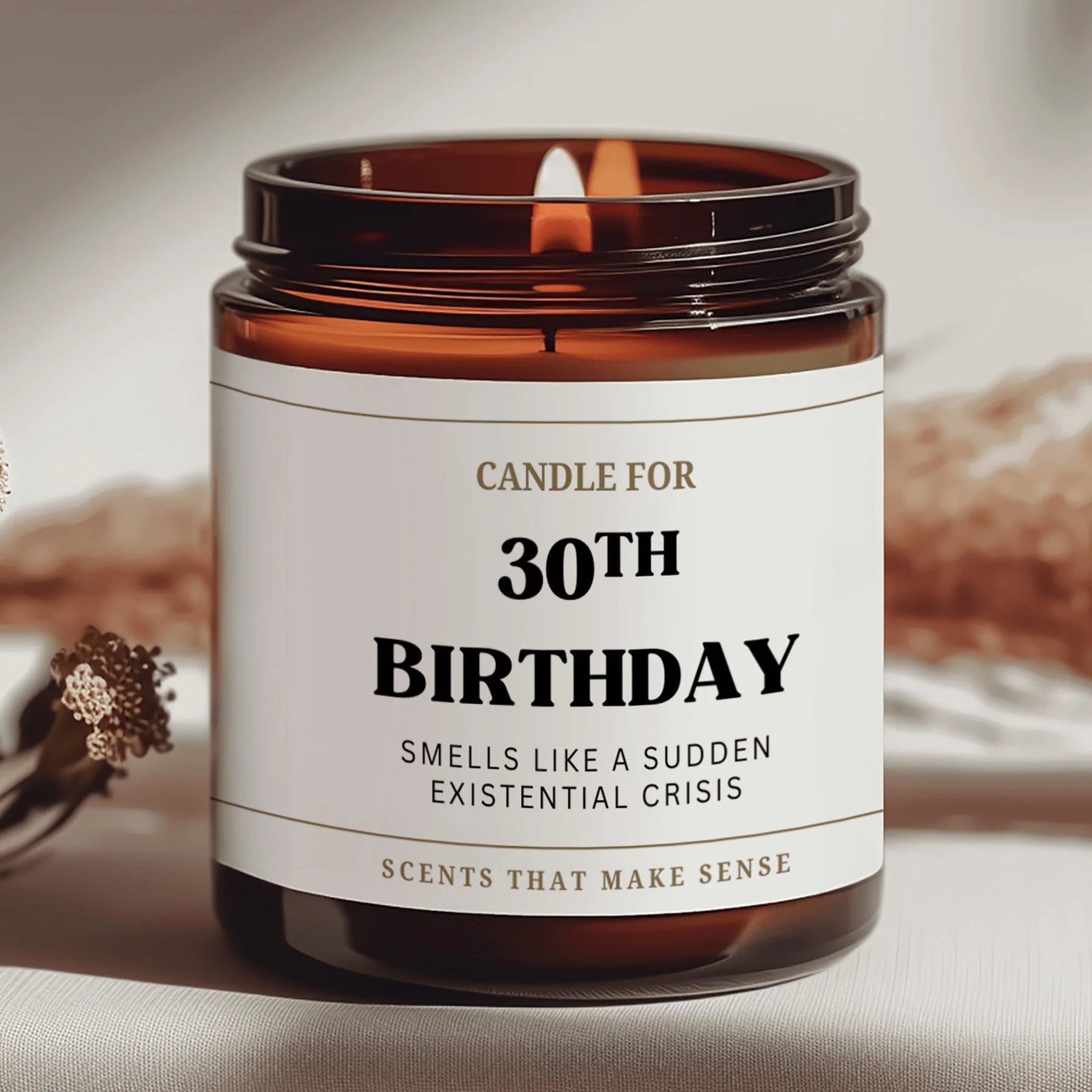 A fun 30th birthday gift idea to commemorate the milestone occasion of turning thirty! The perfect birthday present for a friend who has everything. The funny candle reads 'smells like a pretty old scent'. Original and distinctive gift with a twist of humour and a lovely scent.